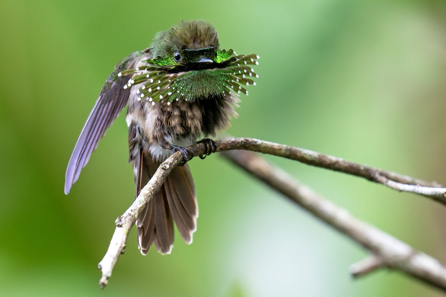 Day 3: Early transfer south to the hills of Santa Teresa in central Espírito Santo. Birding on densely forested slopes, we will look for the endemics Wied’s Tyrant-Manakin, Serra Antwren, White-bibbed Antbird, Yellow-eared Woodpecker, Crescent-chested Puffbird, Grey-hooded Attila, Yellow-lored Tody-Flycatcher, Pin-tailed Manakin, Gilt-edged Tanager and several other Atlantic Forest specialties such as Mantled Hawk, Spot-billed Toucanet, Blue Manakin, and even the rare Russet-winged Spadebill. Checking in at our fabulous hotel, we will enjoy a feast of hummingbirds on the feeders, These include the amazing Frilled Coquette, Amethyst Woodstar, Planalto Hermit, Scale-throated Hermit, and White-vented Violetear. An afternoon visit to the rich Augusto Ruschi Biological Reserve will allows us to try for the rare Salvadori’s Antwren and the discreet Cinnamon-vented Piha. Night in Santa Teresa.
